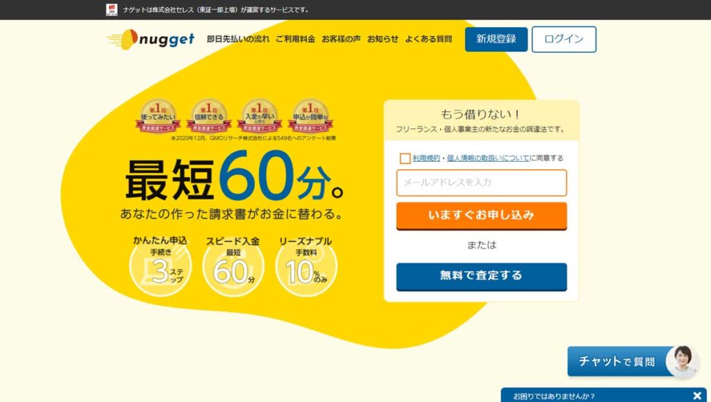 東証一部上場企業であり、複数のモバイルサービス事業を展開する株式会社セレスが運営するファクタリングサービスであり、申し込み、審査など手続きの面倒さを徹底して省くようにサービスが設計されています。